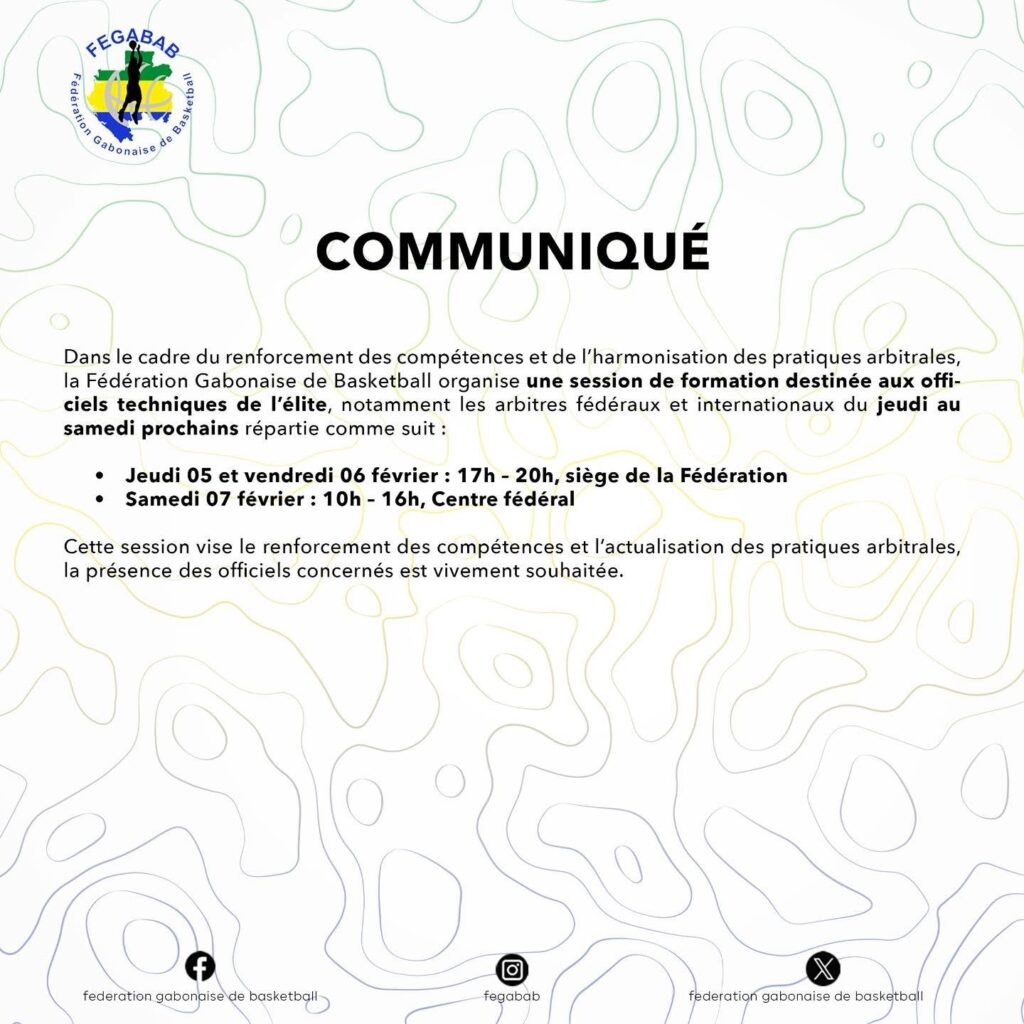 En appelant à une participation massive des arbitres fédéraux et internationaux, dont la présence est vivement souhaitée, la Fédération Gabonaise de Basketball réaffirme sa volonté de rehausser le niveau de l’arbitrage gabonais. Cette session de formation apparaît ainsi comme une étape importante dans le processus d’amélioration continue des performances des officiels techniques, au service du développement durable du basketball national.